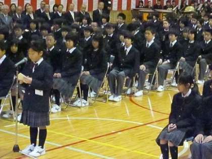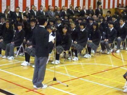 「中学校生活を充実させるために、失敗を恐れず、前向きにつねに挑戦し続けてほしい。そして、その先には、将来の大きな目標が見えてくるはず。その目標達成のため、根気や忍耐力をもって努力し続けてほしい。さらに、これらを支えているのが、『礼儀』と『人を大切にし、素直で謙虚な心』です。」とも述べられました。