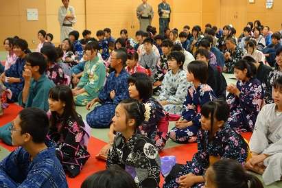 ゆかたに身を包んだ生徒たちは、学年全体会〈写真上〉でルール説明などを受けた後、武道場と地下交流室に分かれてかるた会を行いました。