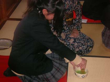 下京の女性会の方に,茶道についての作法や意味を教えていただきながら,