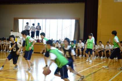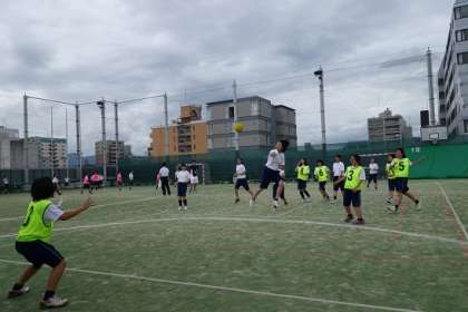 台風8号の接近で、天候が心配されましたが、男子は体育館でバスケットボール、女子は屋上グランドでハンドボールを行いました。