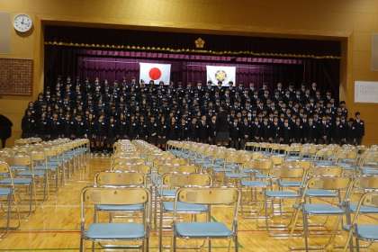 学校長は式辞で、「下京中学校は、8年前に5校が統合されて開校しました。そこには、地域・保護者などたくさんの方々に支えられ、また多くの先輩が『一つにまとまる』『新たな学校づくり』にがんばってきました。」と述べられ、「皆さんもその一員として、3年間、学習をはじめ様々な活動で全力を尽くしてきました。」と続けられました。