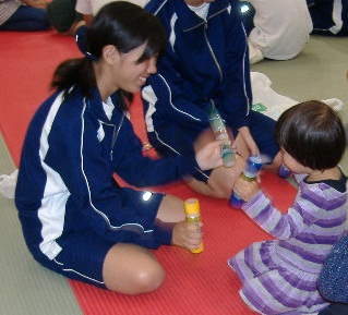 3年生の家庭科の保育領域の授業の一環として、0〜3歳の乳幼児とその保護者と3年生がふれあう取組が行われています。これまで自分の育ってきた過程を振り返り、幼児が健全に育つために周りの人々はどうあったらよいかを考え、実践できる態度を育てることを目的に授業が行われています。
