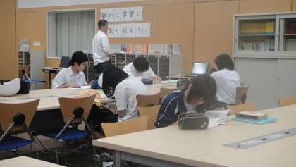 5時30分に部活動を終えて、汗だくで駆けつける生徒の姿も見られました。それぞれの教室に分かれて、自ら持参した「課題」に取り組んでいます。本校教職員だけでなく、学生ボランティアも指導に当たっています。わからないところがあれば、静かに手をあげ、質問する光景も見られ、緊張感の満ちた教室にほほえましい空気も感じられました。