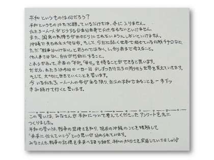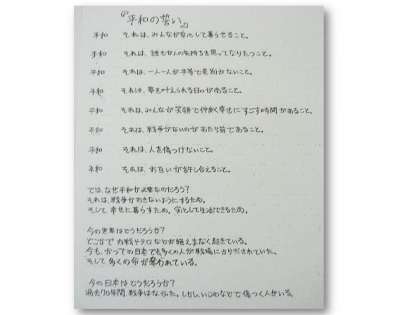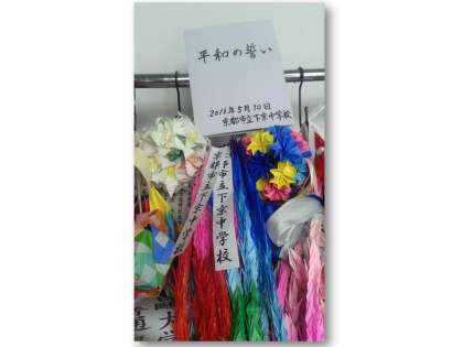生徒みんなで平和について考えたアンケートを元に作成した『平和の誓い』です。千羽鶴とともに奉納しました。