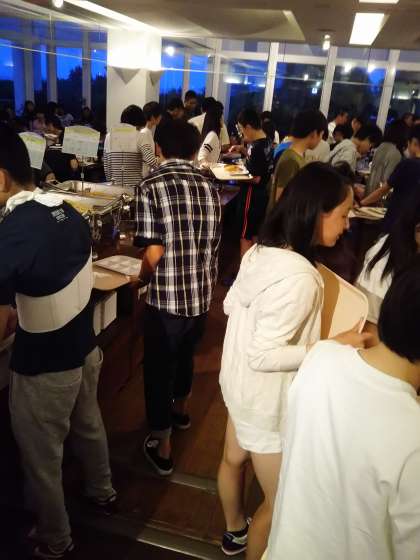 バイキング形式でのおいしい夕食を、楽しくいただいているようです。