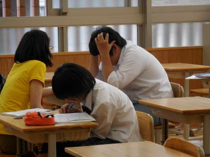 呼吸の音が聞こえるくらいシンと静まりかえり、黙々と学習する生徒、友だちに質問したり、教え合ったりしている生徒、教師に質問したり、相談している生徒と学年ごとに違った雰囲気が見られます。しかし、真剣に学習に取り組む姿勢は、3学年とも共通です。