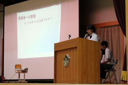 PMIの思考ツールを使った学級討議の内容を反映させた議案は、順調に討議され,各学級から上がってきた質問や要求には、生徒会中央委員会からていねいな回答がありました。また、施設・設備やルール等については、学校からの回答の紹介があり,その後採決にかけられました。