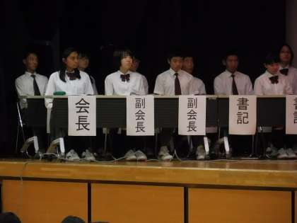 平成28年度の生徒会スローガンをはじめ、活動方針案や予算案・27年度決算報告などの提案がありました。