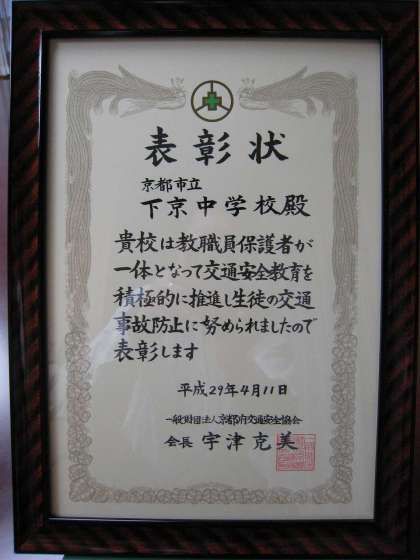 本日,龍谷大学アバンティ響都ホールにて京都府警察本部・京都府交通安全協会主催の交通安全功労者等表彰式が行われ,本校が交通安全優良学校として表彰されました。このような名誉ある賞をいただけたのも,日頃より本校生徒への登下校の安全に対し,地域の皆様からの熱心なお声かけやご指導等のおかげであると思います。また,保護者の皆様には,本校の安全教育に対しご理解やご協力していただいているおかげであると思っております。今後も安心,安全な下京区であるよう啓発活動を推進して参ります。今後ともよろしくお願いいたします。