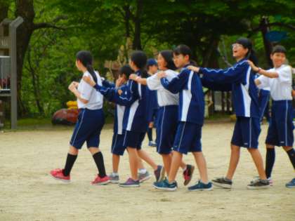 まず最初は、ジャンケン列車(ジャンケンをして負けた者が勝った人の後にくっついていくもの)、次に手つなぎ鬼(鬼につかまると鬼と手をつないでいくもの)を行いました。最後に、学級対抗リレーを3チームに分けて行いましたが、どのクラスも精いっぱいの声援をしていて、すごく盛り上がりました。