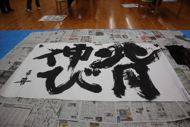 こう語られた後、たっぷりと墨を含ませた巨大な筆を手に、福田先生のからだ全体が大きな画仙紙の上で動き出しました。最初に漢字の「背」、次に「伸」、最後にひらがなの「び」。力強さとしなやかさが同居した「背伸び」の作品が生み出され、その文字はまるで息づいているかのようでした。