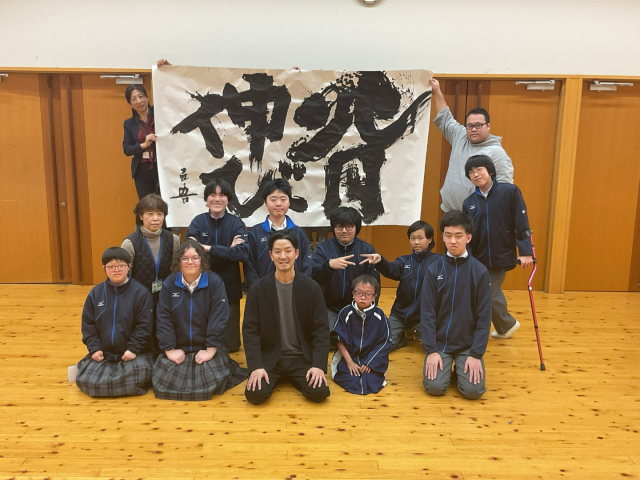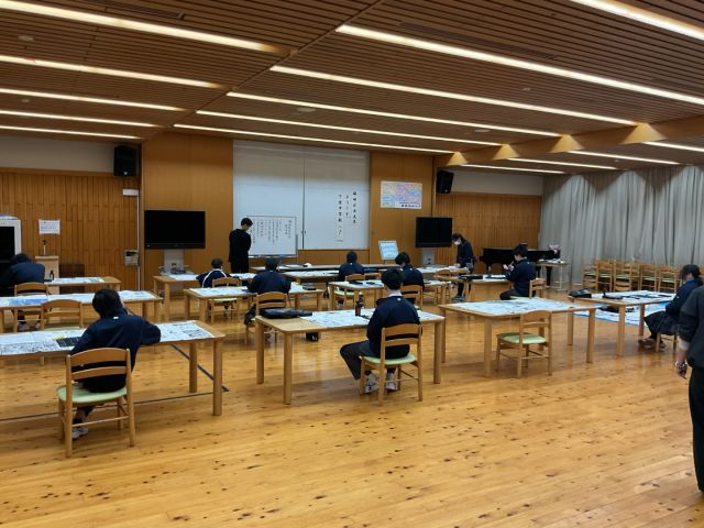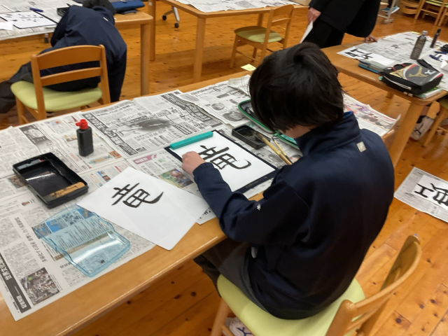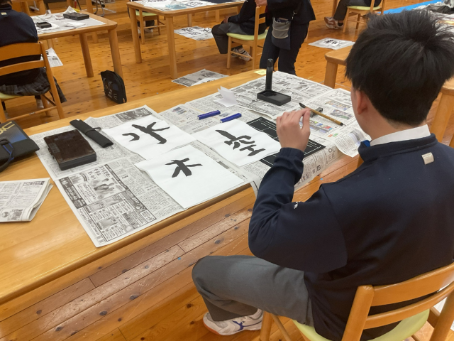 実演のあとは、生徒たちの実習です。半紙に太筆を使い、好きな一字を書きます。「太くてもいいし、紙からはみ出してもいい。縦長でも、細くても構いません。自分が書きたいと思うように書いてください。」生徒たちは集中し、のびのびと筆を運んでいました。