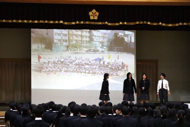 続いて登場した生徒会本部は、タイムマシーンに乗って過去へ戻り、3年間の中学校生活を振り返るという設定でした。学校生活のさまざまな場面が登場し、会場は一気に引き込まれていきました。