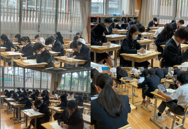 本日、3年生が全国学力・学習状況調査を実施しました。この調査は、教職員や生徒たち自身やが学習状況や学力を把握し、今後の学習や授業改善の教育活動の充実に生かすことを目的としています。国語、数学などの教科に加え、タブレット端末を使用して、画像や音声を用いた問題に取り組むCBT調査も行い、最後には学習の進め方や学校生活について振り返る生徒質問紙にも回答しました。5月1日には、英語の「話す力」についての学習調査を行います。今後は結果を分析し、よりよい学びにつなげていきたいと思います。