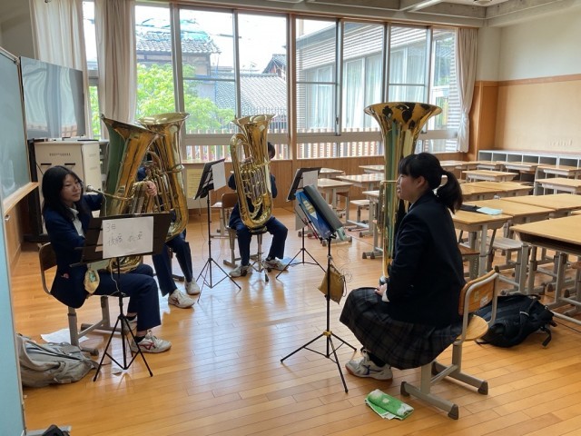 最初にそれぞれにパート練習を行い、その後二校で基礎合奏を行い、