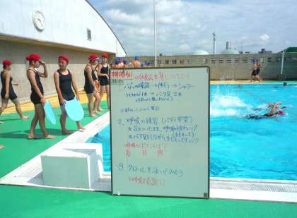ホワイトボードの「本時の目標」「授業の流れ」に沿って、先生からアドバイスを受けながら皆熱心に気持ちよさそうに泳いでいました。