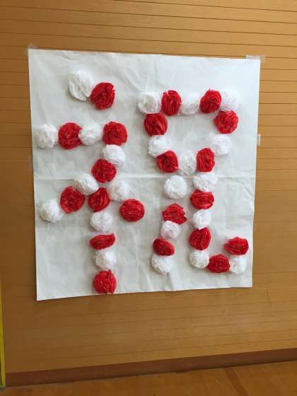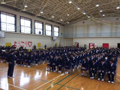 お祝いムードいっぱいに飾りつけられた体育館で、全校生徒がそろって、生徒会主催の迎える会が行われました。