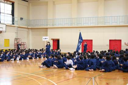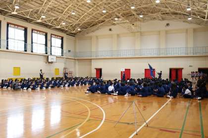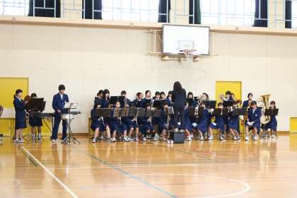 吹奏楽部の爽やかな演奏にのって、プラカード、校旗の生徒会役員が入場します