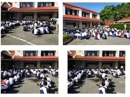お世話になった宿泊先での退館式の様子です。お礼のあいさつをして出発します。いい天気になりました。