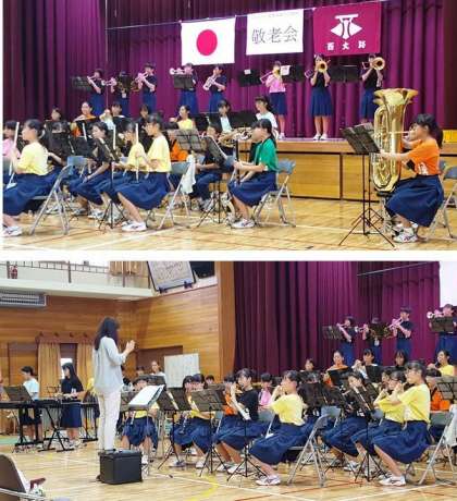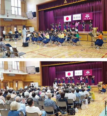 吹奏楽部が地域の敬老会で演奏を披露し、敬老会に参加された皆さんに喜んでいただきました。昭和の懐かしい歌謡曲を中心に選曲しましたが、皆さんリズムを取りながら手拍子で聞いてくださいました。