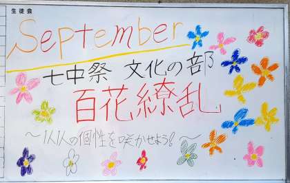 今年度のスローガンは「百花繚乱(ひゃっかりょうらん)」、優秀な人材や美しいものなどが多く集まるという意味です。まさしく七条中学校にピッタリのスローガン!これまでの学習の成果や練習の成果を発揮して、仲間と共に一人一人の個性を存分に咲かせてほしいと思います。保護者の皆様、地域の皆様、応援を宜しくお願い致します。