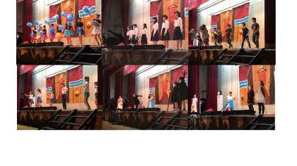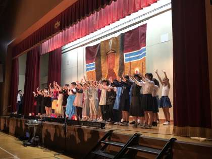 続いては2年生の学年劇 「信でれら!?」です。ダンスあり,笑いあり,そして真剣なシーンもあり。主役のドレスはハンドメイク部の手作りです。劇終了後展示いたします!