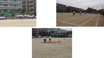 2・3年生が全力で走っています!!次の玉入れの準備も着々と進んでいます!