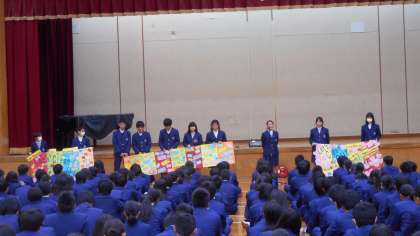 終業式が行われました。社会科、美術科の総合文化祭出品作品、弁論大会、税の作文、サッカー部の表彰が行われました。美化委員会からは先日行ったお掃除し隊のお礼に小学生から送られた作品の紹介がありました。図書委員会からはMy漢字のベスト3の発表、そして生徒会長からは、今年1年をふり返るまとめのお話がありました。