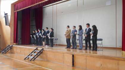 その後、生徒会役員の人から生徒を代表して、離任される先生にお世話になったお礼の言葉が延述べられました。最後の花束贈呈の際には、離任される先生と、生徒会役員の人がしっかり握手し、すべての七条中関係者の益々の活躍と、七条中の発展を誓い合いました。