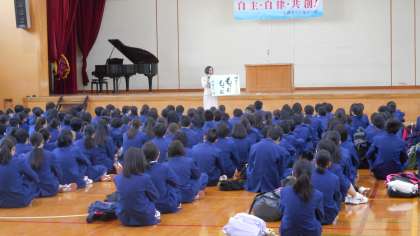 4月のことばは、「もっと、もっと」です。3月の「3年生を送る会」で3年生が群読でお願いした言葉、また卒業式での送辞の言葉、「もっと、もっと、あいさつができる学校に」、「もっと、もっと歌声が響く学校に」「もっと、もっと笑顔があふれる学校に」からとられた言葉です。また先生から、「新鮮な気持ちで前向きに、新年度をスタートさせましょう。」というお話がありました。明日は入学式、私たちは信頼される先輩になれるようにがんばりましょう。