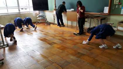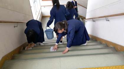 本校では、清掃活動を「ふき掃除」中心に行なっています。教室も、廊下も、階段も、ぞうきんでふき取るので、とてもきれいです。