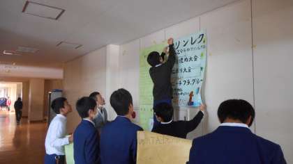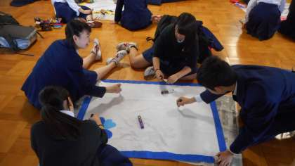 学級旗の製作を行っています。各クラスで考えた学級目標を書いて、それにふさわしいデザインが考えられています。