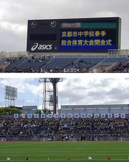 昨夜までの雨も上がり、全市中学校88校、吹奏楽団26校、京都市少年合唱団等が参加し、春体開会式が開催されました。本校からも選手代表と吹奏楽部が参加しました。