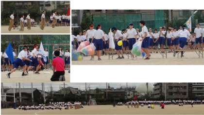 麻袋を飛んで,お玉でボールを運び,風船を割る!そしてゴールへ!!楽しんで発しています!