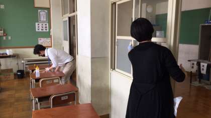 生徒が帰ったあとは、校内の消毒作業も行いました。