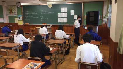 廊下には2年生の終わりの休校期間に取り組み、3年生になってから回収された「PEACEレポート(平和学習レポート)」が掲示されていました。自分の祖父母から聞き取った戦争体験の話や、戦争や平和をテーマとした作品を見て感じたことなどが、丁寧にまとめられています。