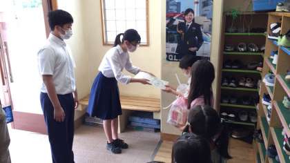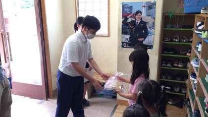 休校期間中に生徒会が全校生徒に声をかけ、集まった手作りマスクは児童館の子どもたちがうれしそうに受け取ってくれました。