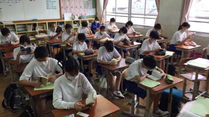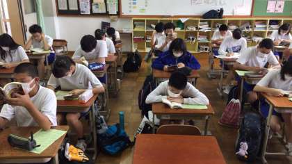 七条中学校の朝は「朝読書」からはじまります。みんな静かに本と向き合っています。多くの先生も、生徒と一緒に読書をされています。