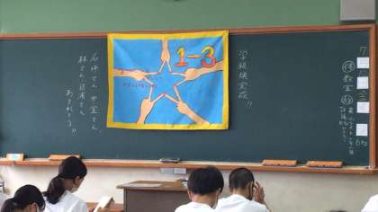 朝一番の黒板には、完成したばかりの「学級旗」が飾られているクラスがありました。