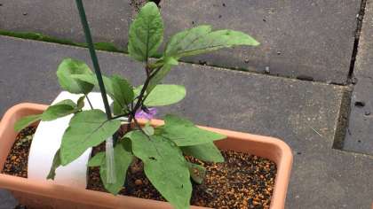 1組が育てている植物が大きくなり、ナスが紫の花を咲かせていました。