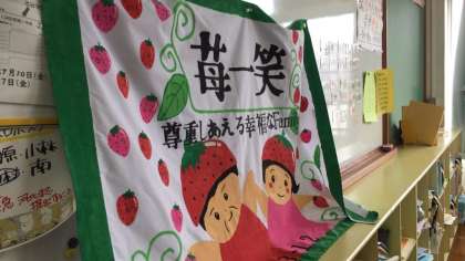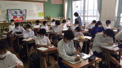 3年2組の授業風景と、教室の掲示物等の様子です。完成したばかりの「学級旗」も教室の後ろに掲示されていました。