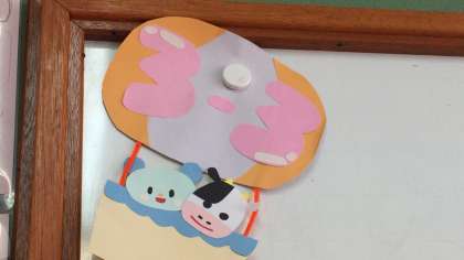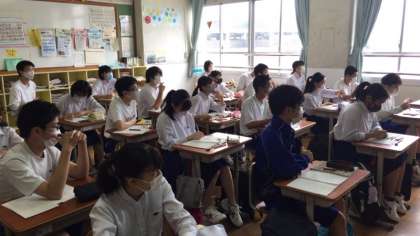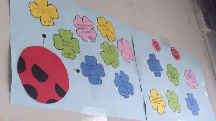 3年3組の授業風景と掲示物等の様子です。四つ葉のクローバーの掲示物には、目標や願いが書かれていました。