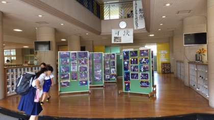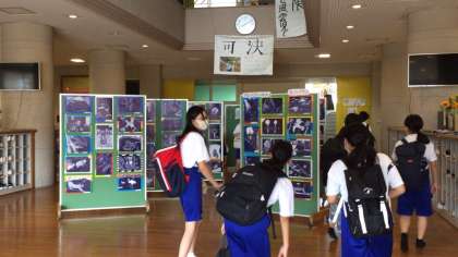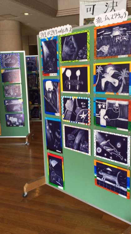 ピロティーでは、3年生の美術の作品を展示しています。この作品は2年生の時に制作したものです。「消しゴムスクラッチ」という手法で作られています。黒と白のコントラスト、優しい風合いの素晴らしさをぜひご覧ください。