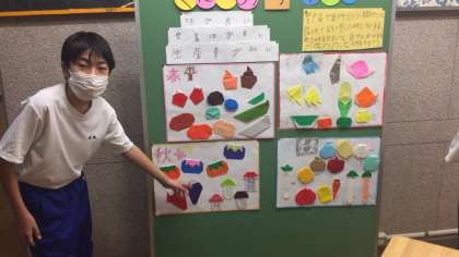 1組の家庭科では、季節ごとの「旬の野菜や果物」を折り紙で製作し、一覧にまとめました。できあがった作品を前に、説明をしてくれました。