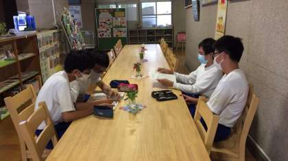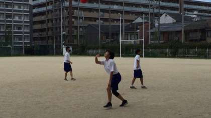 選書会の一方で、グランドで遊んでいる生徒の姿もありました。サッカーをしたり、本格的にバレーのサーブレシーブをしたりしている生徒もいます。ピロティーのテーブルでは勉強している生徒の姿もありました。
