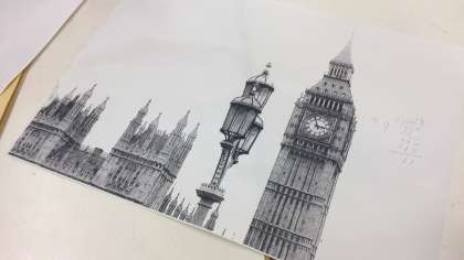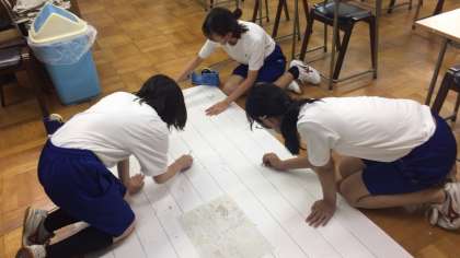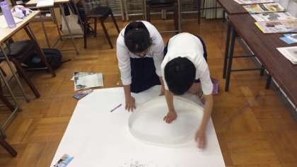 美術部では今、共同制作に取り組んでいます。ピロティーの時計を利用した作品や、階段アートを制作中です。