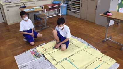 1組の英語では、学校周辺のエリアマップを英語で作っています。パソコンの地図で、周辺の建物やバス停なども確認しながら取り組んでいます。