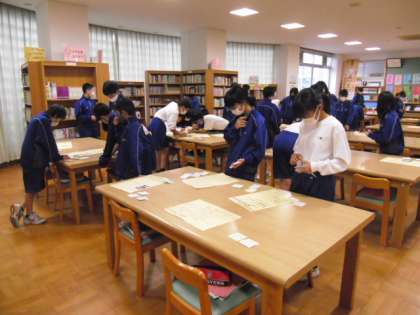 オリンピック・パラリンピックに関する調べ学習制作物(ポスター)のお披露目です。写真は来週のポスターセッションに向けて他の人の内容を見て,気付いたことや疑問に思ったことを付せんに書いて貼っているところです。このあと,付せんの内容をもと,読み原稿の修正や発表の準備を行いました。発表後は,学年のフロアに掲示します。