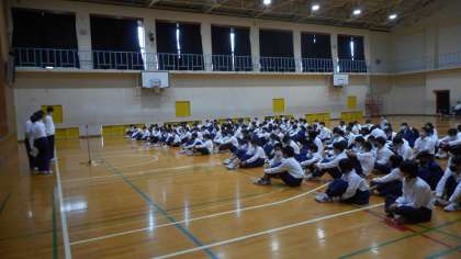 体育の部を写真スライドでふり返り、先日学年生徒全員が書いた「七中いいとこみつけ」の紹介、体育の部の団体種目の表彰、8月〜10月16日生まれの人のHappy Birthdayそして来週月曜日に学習する「殸の形」の紹介、20日(火)におこなうパラスポーツ体験型出前授業明日にチャレンジ”「あすチャレ!スクール」の紹介等を行いました。この「あすチャレ!スクール」では車いす陸上の永尾嘉章さんに来校していただきます。新聞社や、TV局の取材もある予定です。