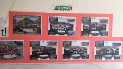 階段には合唱コンクール・体育大会・修学旅行の集合写真も掲示しています。
